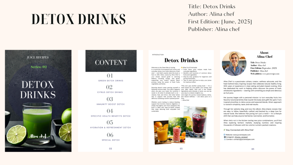 Your journey to a healthier, more energized lifestyle begins here. This eBook is your ultimate companion for cleansing your body, boosting your immunity, and revitalizing your routine — all through the power of delicious, nutrient-packed detox juices. Here’s a sneak peek at what you’ll find inside: