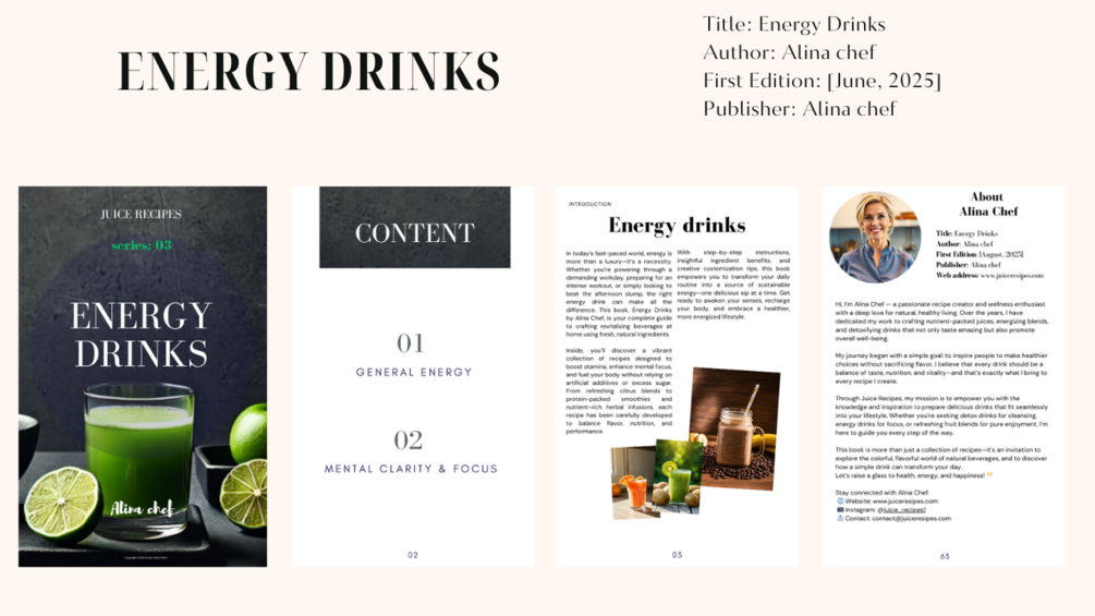 "Energy Drinks by Alina Chef" is your go-to guide for crafting natural, healthy beverages that boost energy, focus, and performance—without artificial additives or excess caffeine. Packed with recipes made from fresh fruits, nutrient-rich vegetables, and superfoods like matcha, chia seeds, and cacao nibs, this book helps you enjoy both flavor and nutrition in every sip.