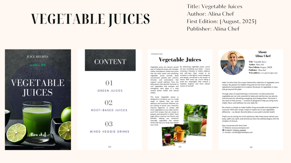 Vegetable Juices is a refreshing collection of recipes that transform everyday vegetables into delicious, nutrient-rich drinks. From leafy greens to root vegetables, each juice is carefully crafted to boost energy, support detox, and promote overall well-being.